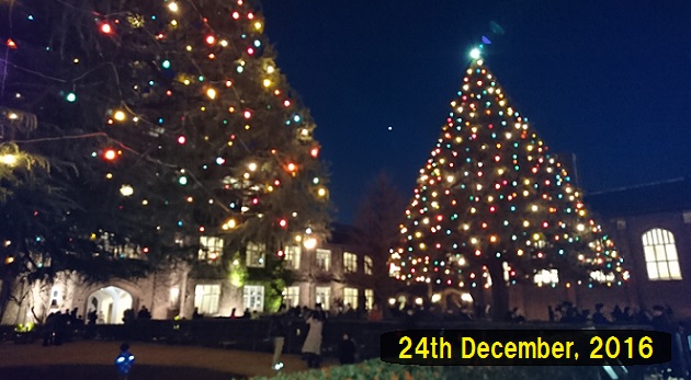 クリスマスイヴに立教大学の前を通りかかりました。校庭を開放しているようですので入ってみました。伝統を感じさせる素晴らしいキャンパスでした。昨今はLED電球を使ってチカチカ点滅させる壮麗なイルミネーションが多いですが、ヒマラヤ杉にかけられているこちらのイルミネーションは点滅しない昔風。温かみを感じる風景です。二つのツリーの間に一等星が輝いていました。この星は何?
