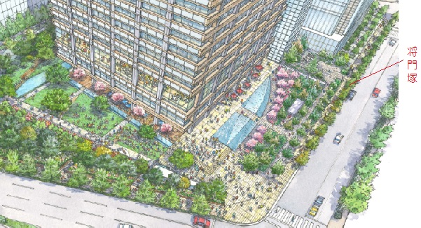 三井不動産のプレスリリース用の資料によると、将門塚は整備された大きな緑地帯に囲まれて鎮座することになります。