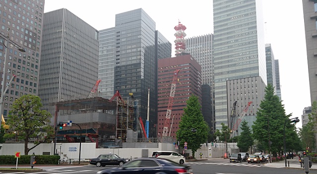 大手町1丁目交差点に向うと、経団連本部のビルの裏側にある大手町1丁目1番、2番の全区画のビルが消滅していることに気がつきました。近づいてみると再開発のためのクレーンが林立して、ダンプカーが頻繁に出入りを繰り返していました。