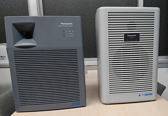 マイクロフォン設備にもタフな奴が。左上のパナソニックの800メガのスピーカー・チューナー一体型のポータブルアンプ。昔は定番商品でした。これも実はほぼ創業時から使っています。最近チューナー等に不具合が出て右上の新製品に変わりました。3波の無線マイクが使えます。グレー君、ご功労さん。ありがとう。