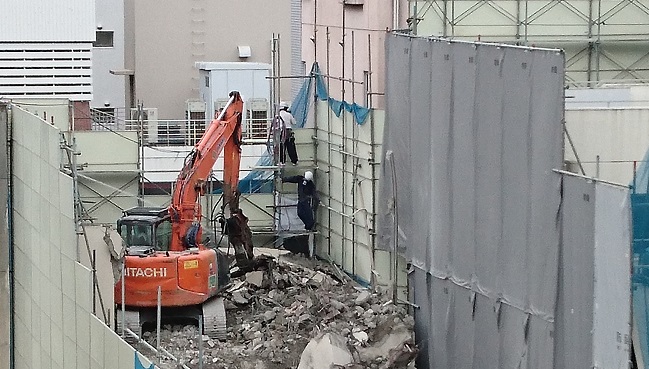 会場ビルの向かいに見える4棟のビルのうち、南側のビルの2棟の解体工事の様子が会場から見えますが、現在油圧式ショベル(通称ユンボ)の先端が巨大なハサミのようなもので解体しています。このやり方はあまり大きな音がしません。コンクリートをぐしゃぐしゃと潰す音が主です。
