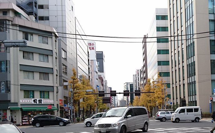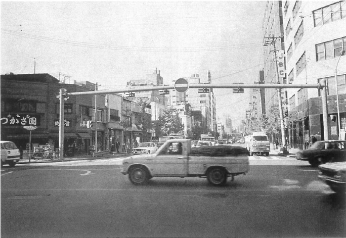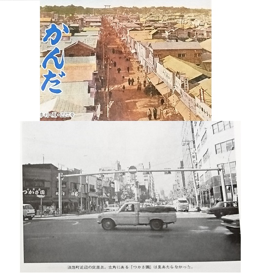 最近近所の人に神田地区の小さな季刊誌「かんだ」というものを見せてもらいました。「神田半世紀(あのころのかんだ)」という特集が組まれていて、フォーラムミカサ エコ近くの司町交差点から美土代町方面を写した古い写真が載っていました。写っているビル、街路樹イチョウの大きさ等、いろいろ時代考証をしたところ昭和46、7年頃の写真という気がします。写真の解説には「淡路町近辺の交差点」とありましたが、編集者はここが司町交差点であることに気がついていないようです。