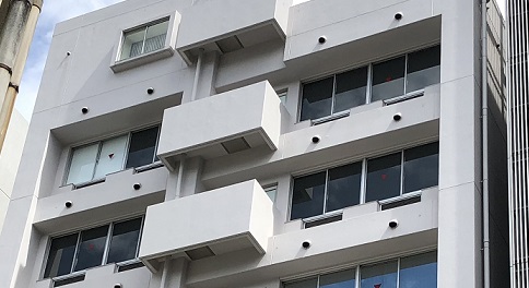 外から見る真黒な窓の異様な当会場の7Fホール・8Fホール