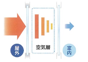 音を防ぐ最初のバリヤー(外窓)を通過して弱まった音波を更に大きなバリヤー(内窓)で防ぎ、音波を極力弱めるというイメージです。