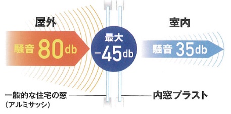 大信工業のパンフレットによると、内窓に「内窓プラスト」を使えば最大45デシベルの室外騒音がカットされ、図書館並みの35デシベルという環境が実現されるということです。あくまでもカタログ値で、設置環境や周波数等の音の質にもよるとは思いますが、そのクォーリティーの高さは製品に触れてみれば分かります。