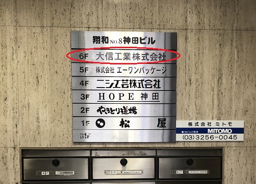 ネットで調べて分かったのですが、この大信工業という会社の首都圏営業部が、実はフォーラムミカサ エコのすぐ近くにありました。エコから見える神田駅西口商店街入口にある牛丼の「松屋」が入っているビルの6階が大信工業です。製品のショールームがあるというので9月中旬に訪ねてみました。
